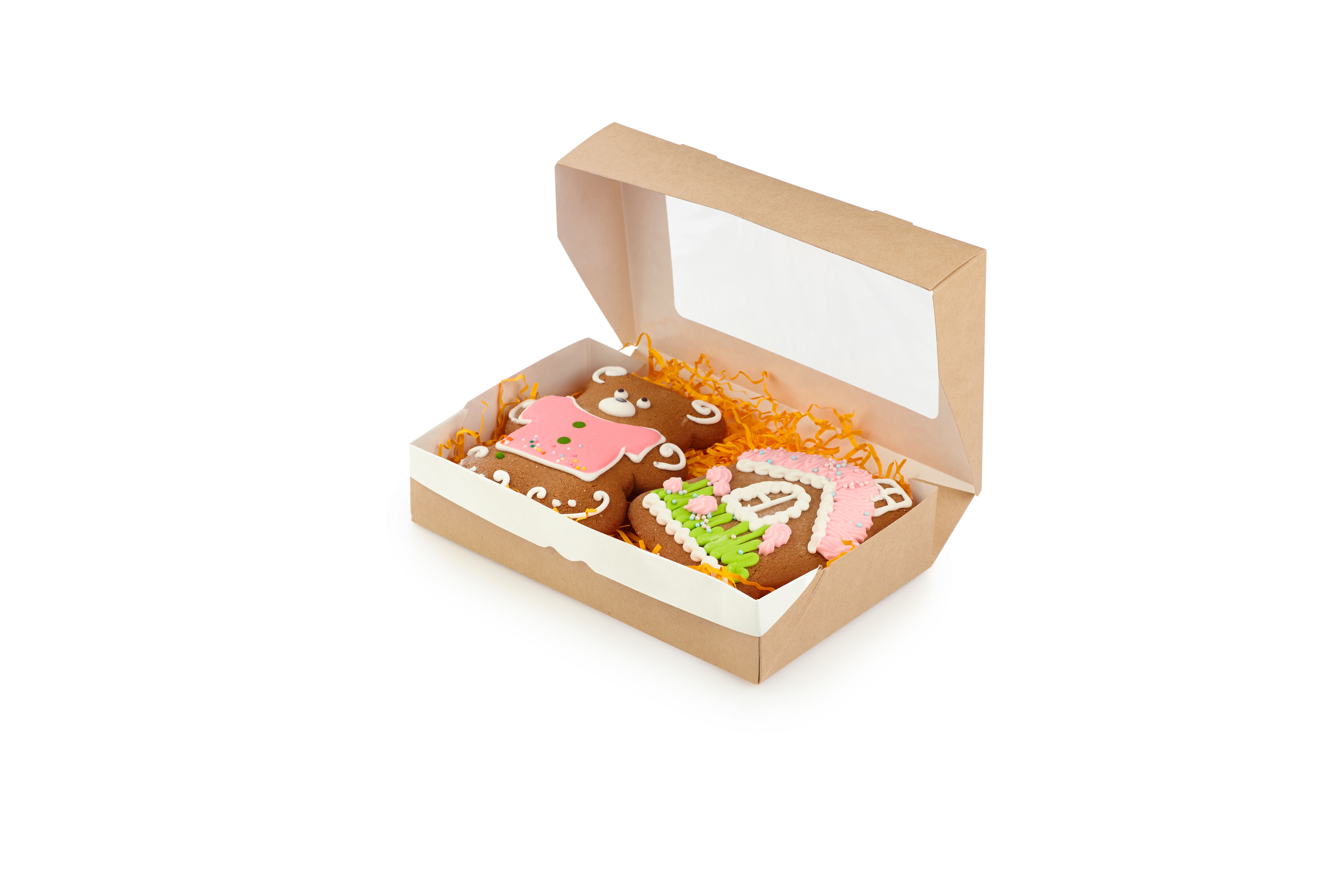 - если упаковываете пряники в эту коробку, уложите их на стружку крафт бумаги – это стильно и красиво смотрится.